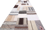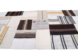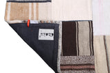This is a new approach to the production of Turkish kilims. Beautiful plain flatweaves from vintage curtains, grain sacks, and throws are collected from the different regions of Anatolia. These unique, distinctive weavings go through many different steps in the process of selection, cleaning and preparation, etc. Then talented designers patch together the different pieces of kilim material with specialized sewing techniques, creating brand new contemporary looking kilims. The final product is both “ethnic” and “contemporary”, perfectly matching pieces of numerous flatweaves.